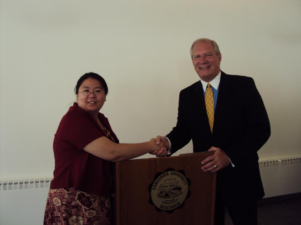 MBA班學習委員章娟同學與威斯康州-Mequon市長合影(市長兼CUW系主任)